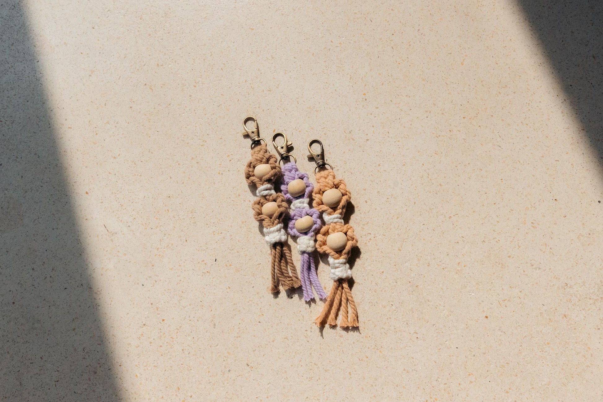 The Flora Macrame Keychain is made using organic cotton and wood bead accents. Featuring a flower pattern in three color options. Sold individually or as a set of 3. Each keychain is handmade and great for gifting.