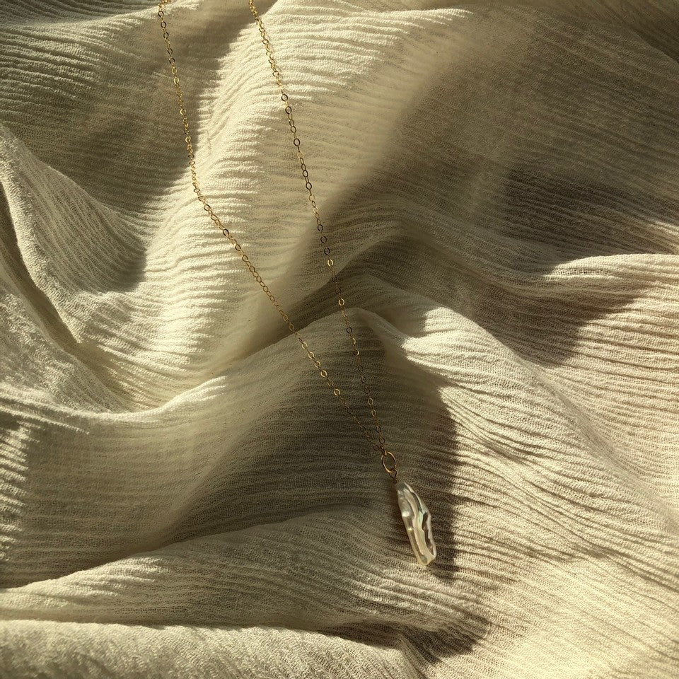 Dainty chain featuring a unique and one of a kind Keishi pearl that has a beautiful lustrous shine. Each one may vary slightly in size and shape due to the nature of cultured pearls. Inspired by Hanalei Bay, Kauai.