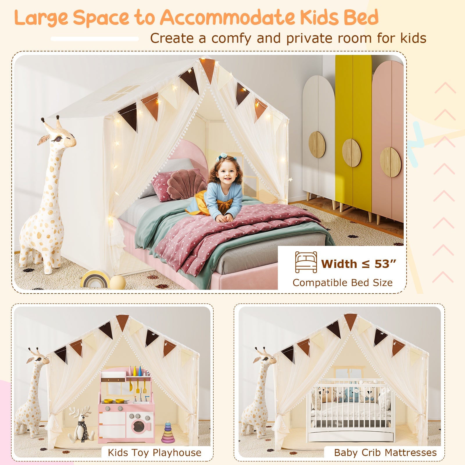 ● Large inner space can accommodate 3-4 kids● Door curtain with screen combines easy accessibility breathability and privacy● Equipped with a rear window a side window and a skylight for better ventilation● Light string with star lights emits soft warm glow● Colorful flags and plush pompoms one the screen create a charming appearance● Included cotton mat is soft & skin-friendly● All fabrics are machine washable for easy maintenance● Versatile play tent allows kids to enjoy reading or have fun● Equipped with fixing ties to secure the door curtain● Easy to attach the canopy of the tent with convenient hook & loop fasteners● Tool-free connectors ensure quick assembly● Suitable for kids above 3 years old